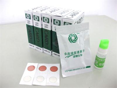 農藥殘毒速測卡是用對有機磷和氨基甲酸脂類農藥高敏感的膽堿酯酶和顯色劑做成的試紙,該試紙具有操作方便,不需要專門配制試劑和專業培訓,靈敏度高等特點,是農貿市場、超市、學校、酒店、工廠等場所進行快速檢測農藥殘留的產品。